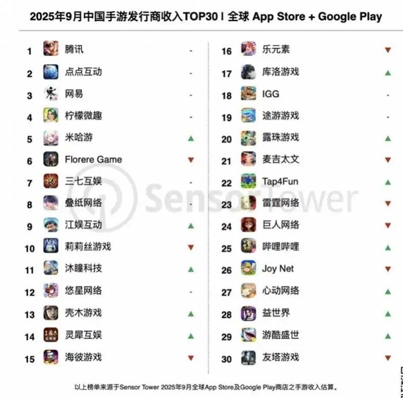 2025年游戏产业迎来显著增长态势。Sensor Tower商店情报平台显示,2025年9月共32个中国厂商入围全球手游发行商收入榜TOP100,合计吸金19.5亿美元,占9月全球TOP100手游发行商收入36.1%。