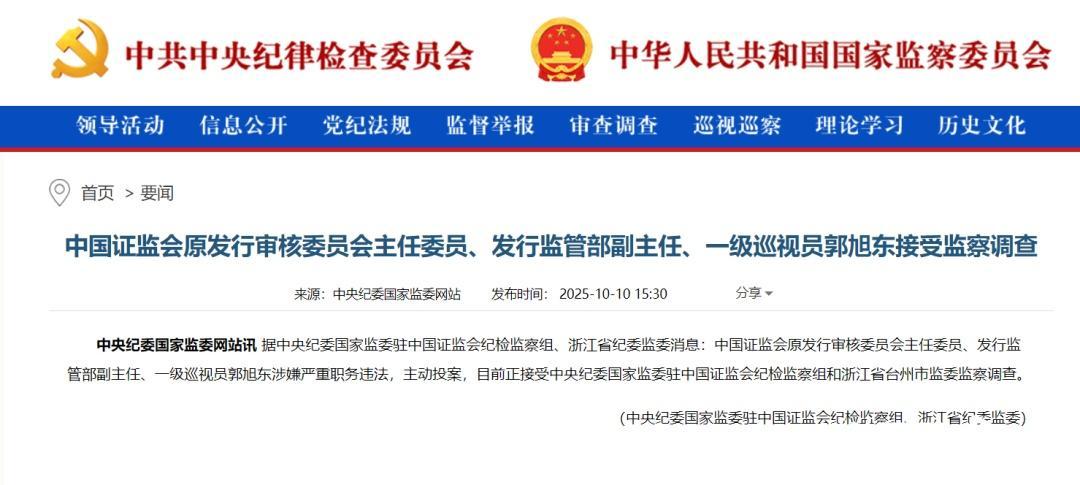 10月10日,据中央纪委国家监委驻中国证监会纪检监察组、浙江省纪委监委消息:中国证监会原发行审核委员会主任委员、发行监管部副主任、一级巡视员郭旭东涉嫌严重职务违法,主动投案,目前正接受中央纪委国家监委驻中国证监会纪检监察组和浙江省台州市监委监察调查。