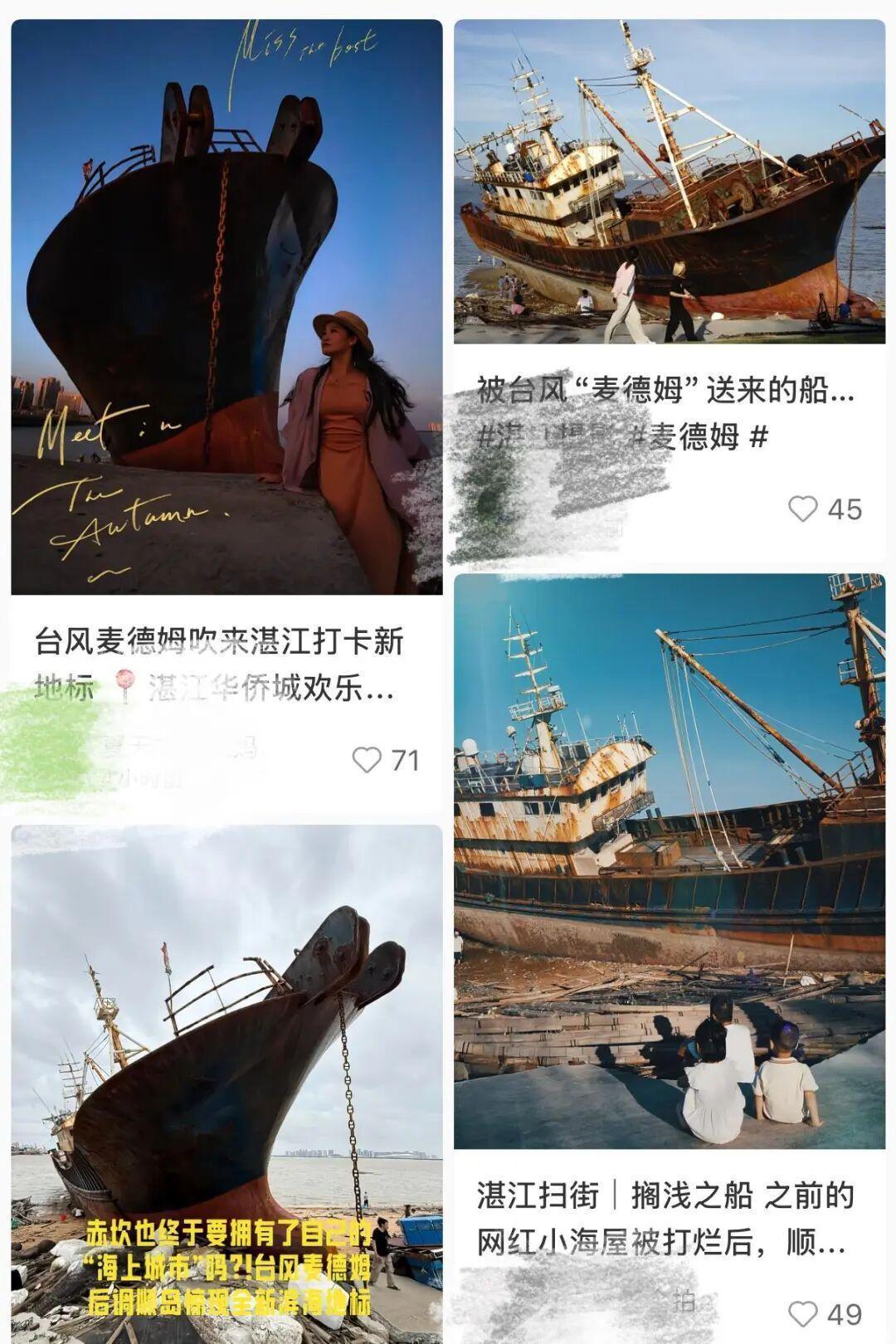 台风“麦德姆”将一艘轮船刮到湛江调顺岛的海岸边,网友纷纷打卡,还发布了拍照攻略。画面显示,一艘轮船搁浅在海岸边,倾斜至几乎45度角,船身呈现出斑驳沧桑感,网友称其为湛江新晋打卡点、“新布鲁威斯号”,还有人呼吁湛江文旅部门接住台风刮来的流量,也有网友担心轮船处于倾斜状态,“一旦侧翻,会有安全隐患”。